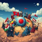 A stylized depiction of a multipolar world: several powerful nations represented by distinct, symbolic figures, each with their own sphere of influence, interacting in a complex, dynamic, and sometimes tense, global landscape. Use vibrant colors and intricate details.