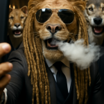Photorealistic vertical selfie, 9:16. The shot is captured by the front camera of a smartphone held at arm’s length by a lion in a sharp charcoal three-piece suit (skinny tie, Ray-Ban-style aviators). The lion’s mane is braided into long, waist-length dreadlocks; thick silver rings and stacked bracelets on his paws. He leans toward the lens, smiling, exhaling a dense vape cloud that catches the key light. The phone and the lion’s arm are visible at the edge, and the phone screen glow reflects subtly in the aviators. Group selfie composition, “awards night” energy: clustered close behind