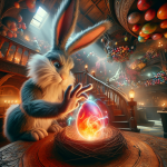 Masterpiece (wide angle shot) , Easterbunny crafting an incantation, (creating a little colorful magic egg in a nest:1.6), standing on an old carved table in a colorful factory laboratory. fantastic view
