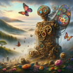 A whimsical steam-powered automaton, adorned with intricate brass gears and colorful stained glass panels, stands atop a misty hill at sunrise. Surrounding it are fluttering mechanical butterflies and blooming clockwork flowers, creating a captivating scene of nature and invention harmoniously intertwined.. Photorealistic style, vibrant colors.