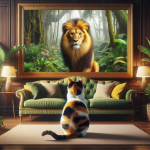 A realistic scene of a small house cat sitting in a cozy living room, gazing into a large mirror. The cat’s reflection in the mirror shows a majestic lion standing in the middle of a dense jungle. The living room features soft furniture, warm lighting, and some indoor plants, while the reflection in the mirror reveals a vibrant, wild landscape with tall trees and rich greenery, creating a stark contrast between the domestic setting and the wild lion’s natural environment. The image symbolizes inner strength and transformation.