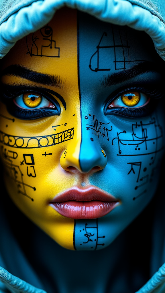 A close-up of a face adorned with intricate black and blue patterns. The left side of the face is predominantly yellow, with symbols and doodles, while the right side is dark, featuring mechanical elements. The eye on the left is a striking shade of yellow, contrasting sharply with the surrounding patterns. The face is partially covered by a hooded garment, cinematic_1940s cinematic_octane