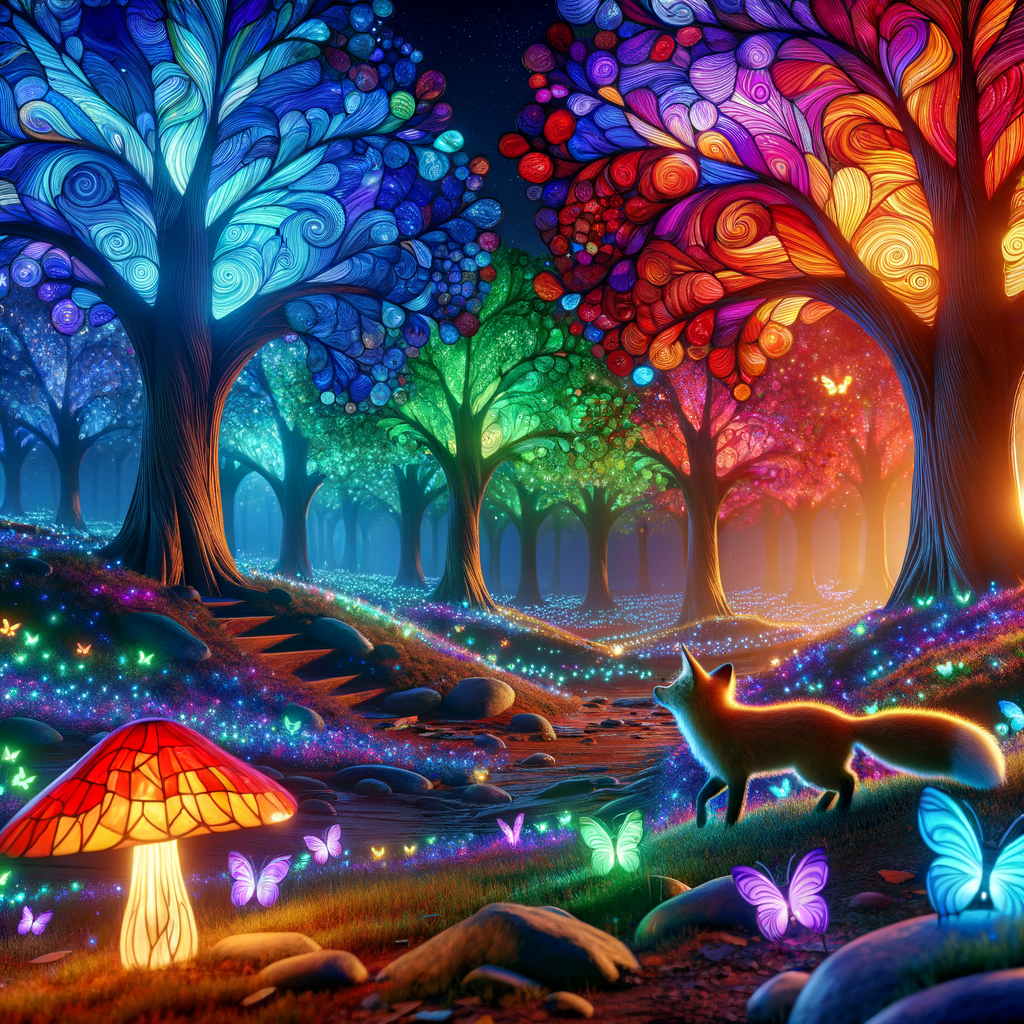 A whimsical forest where trees have colorful stained-glass leaves, casting vibrant patterns on the ground. A curious fox with a shimmering coat investigates a glowing mushroom, while ethereal fireflies swirl around, illuminating the scene in a magical twilight glow.. Photorealistic style, vibrant colors.