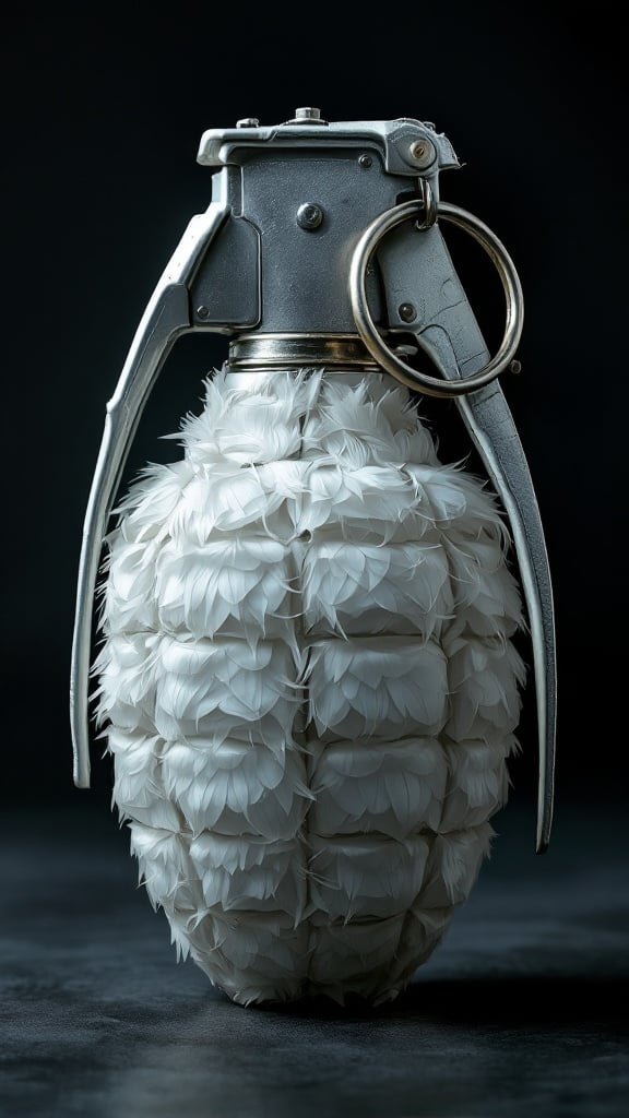 A hyper-realistic close-up of a hand grenade, but instead of a metal body, the entire surface is made of soft, white bird feathers. The feathers are intricately layered, mimicking the classic grooves and shape of a real grenade. The pin and safety lever remain metallic, contrasting with the delicate organic texture. The lighting is dramatic, emphasizing the softness of the feathers against the harsh form of the weapon. Set against a dark, moody background to enhance the surreal, symbolic tone. Photorealistic detail, vertical composition.