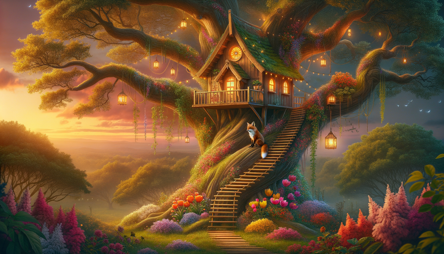 A whimsical treehouse nestled in the branches of an ancient oak, adorned with lanterns, colorful flowers, and a winding staircase. A curious fox peeks out from a window, while a gentle breeze rustles the leaves, hinting at secrets held within. A sunset paints the sky in warm hues.. Photorealistic style, vibrant colors.