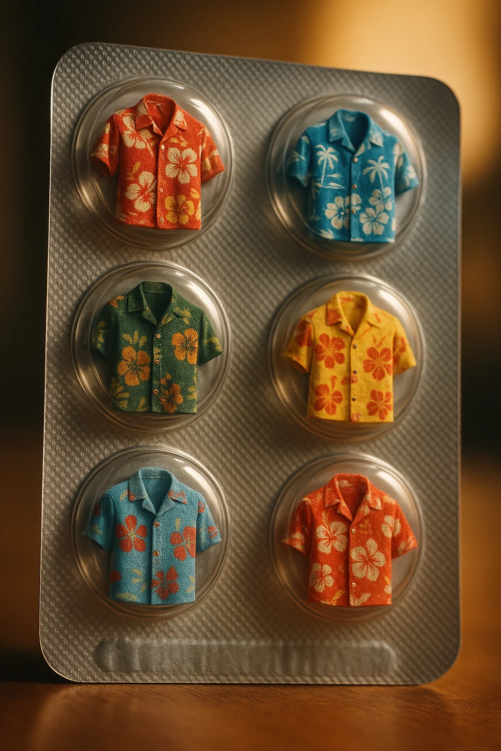 create the most photorealistic close-up of a blister pack of pills, only instead of pills, Hawaiian-print summer shirts of different colors, and the frame was cinematic and advertising
