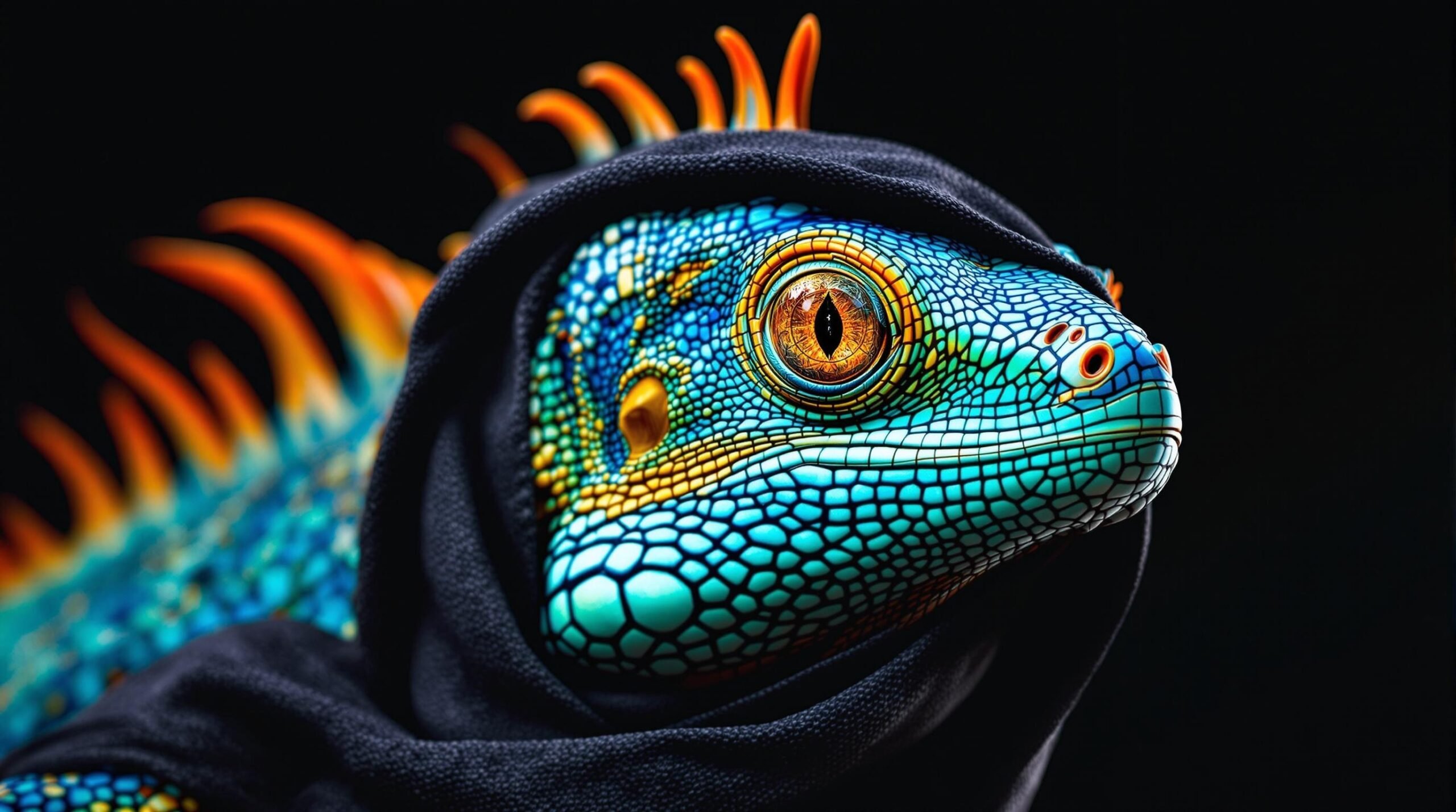 Close-up portrait of a majestic iguana with vibrant blue-green scales, piercing amber eyes, and orange spiky crest. Intricate textures and details visible on scaly skin. Wrapped in dark hood, giving regal appearance. Dramatic lighting against black background. Hyper-realistic, high-resolution image showcasing the reptile’s expressive features and coloration.