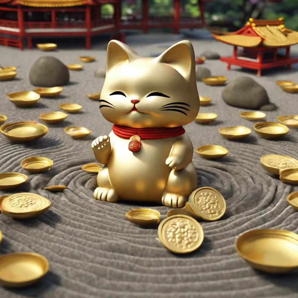animation 3D of a maneki-neko with lots of coins falling around, background of traditional zen garden