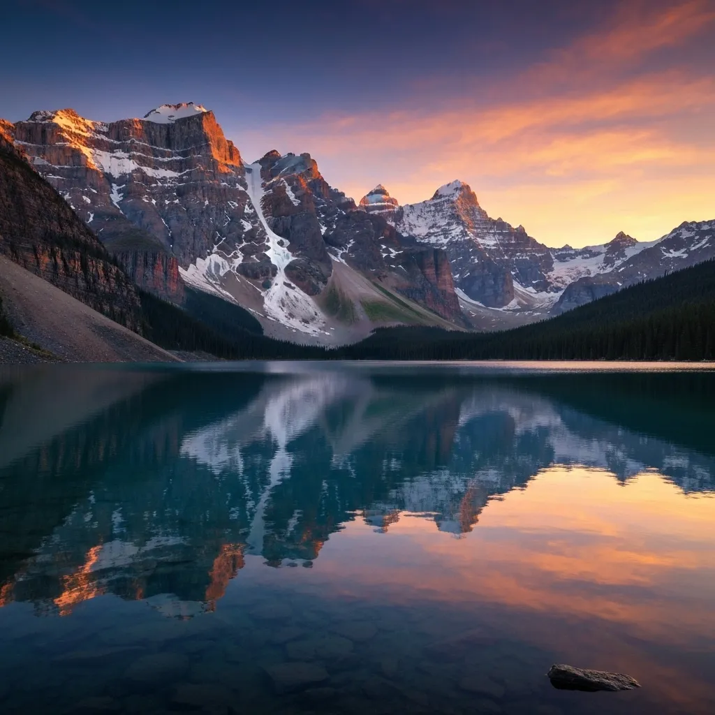 A hyperrealistic photo of a majestic, snow-capped mountain range at sunset, with a crystal-clear lake reflecting the vibrant colors of the sky. Golden hour lighting, sharp details, 8k resolution, cinematic composition, breathtaking vista, Canon EOS R5.