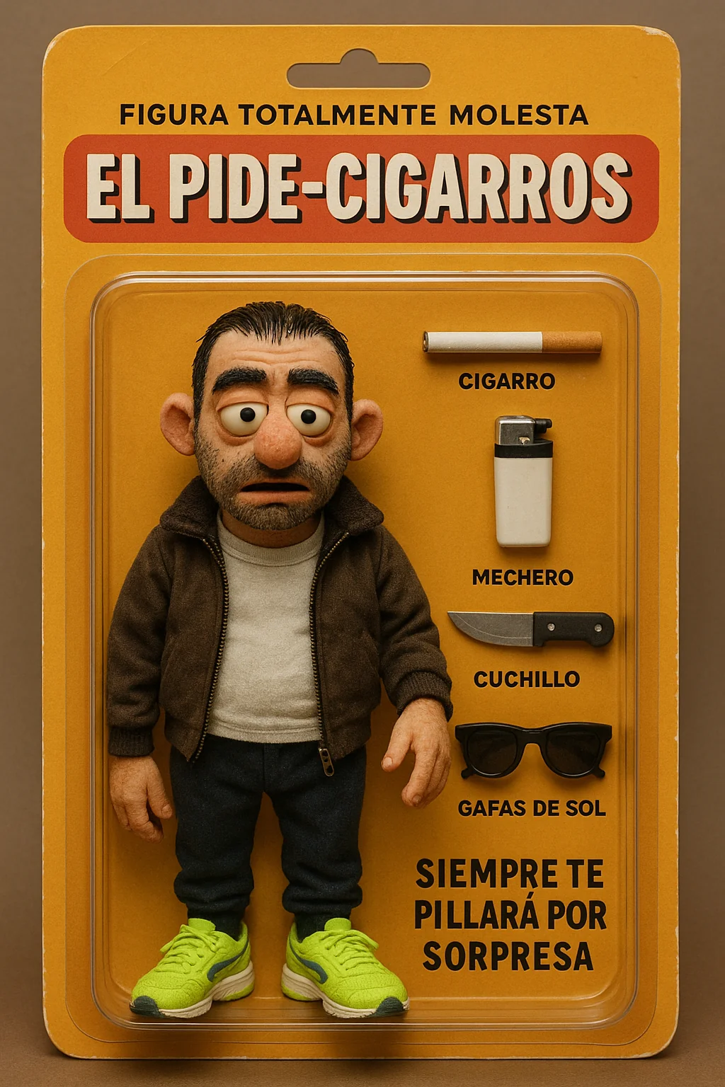 Hyperrealistic toy still in its box that represents “el pide-cigarros” (the cigarette-beggar) with lots of accompanying accessories, such as a cigarette, a lighter, a large knife, and sunglasses. The packaging will feature witty text in Spanish, and the toy inside perfectly represents the disorder artistically. The figure will be a Muppet-style doll of a young Romani boy with very little short hair, wet and slicked back, wearing brightly colored sneakers.