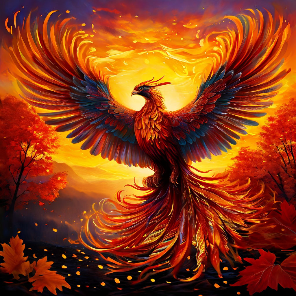A majestic phoenix rising from a bed of autumn leaves, its fiery feathers radiating warmth and light. Surrounding the bird, swirling leaves dance in the air, reflecting golden sunlight, while a distant mountain range stands silhouetted against a twilight sky.. Photorealistic style, vibrant colors.