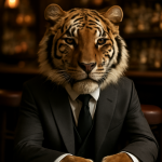 photo of a tiger dressed suit and tie sitting at a table in a bar with a bar stools, award winning photography, A whimsical treehouse perched high in an ancient oak, draped in vibrant, blooming flowers. A curious fox peeks from the entrance, while fireflies dance in the twilight. A wooden swing hangs from a branch, swaying gently in a soft breeze, capturing the magic of a hidden forest paradise.