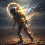 A surreal, low-angle cinematic portrait of an astronaut dissolving into pure stardust and energy, standing dramatically against a desolate, dry earth field under a brooding, ominous twilight sky filled with dark, churning clouds. The vintage, beige-white space suit is intensely detailed and wrinkled, capturing a feeling of weight and wear, while the figure is positioned in a dynamic, almost dancer-like lean, facing away from the viewer. Brilliant streams of luminous, electric golden energy and multicolored cosmic glitter explode from the back and side of the suit, tearing through the fabric and coalescing into bright, swirling arcs of lightning that frame the figure’s helmet. The dark visor reflects the stormy, glowing atmosphere, while the foreground earth is rendered in highly textural, dry brown tones contrasted by the heavenly, blinding light emanating from the cosmic disintegration. Hyperdetailed, volumetric lighting, photorealistic, octane render, concept art, 8k.