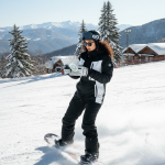 A photorealistic image of Arely working on a device while snowboarding in Japan during the day. The natural light is bright due to abundant snow, creating high contrast. The camera angle will be dynamic, capturing the motion and the snowy environment, with a mid-shot to full-shot framing. The scene will feature deep snow and possibly natural elements of a Japanese ski resort.