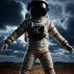 Un retrato cinematográfico surrealista, en contrapicado, de un astronauta disolviéndose en puro polvo de estrellas y energía. La figura se yergue dramáticamente sobre un campo desolado y seco en la Tierra, bajo un cielo crepuscular ominoso y melancólico, lleno de nubes oscuras y arremolinadas. El traje espacial vintage, de color blanco-beige, está intensamente detallado y arrugado, capturando una sensación de peso y desgaste. El personaje está en una pose dinámica, casi como la de un bailarín, de espaldas al espectador. Brillantes corrientes de energía dorada, luminosa y eléctrica, junto con purpurina cósmica multicolor, explotan desde la espalda y el costado del traje, rasgando la tela y fusionándose en arcos de relámpagos brillantes que enmarcan el casco. El visor oscuro refleja la atmósfera tormentosa y brillante, mientras que la tierra en primer plano se muestra con texturas secas y marrones que contrastan con la luz celestial y cegadora que emana de la desintegración cósmica. La escena se caracteriza por una iluminación volumétrica hiperdetallada, un estilo fotorrealista tipo Octane Render, y una calidad de arte conceptual en 8K.