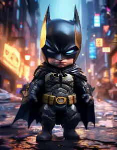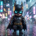 An ultra-detailed, photorealistic rendering of a stylized collectible chibi Batman action figure, featuring heavy, textured tactical armor and a matte black cowl with sharp golden ears. The figure stands low on wet, reflective cobblestones, dramatically lit by the vibrant bokeh blur of neon cyberpunk signs dominating the 16:9 wide-angle background. Intense cinematic volumetric lighting illuminates the scene, highlighting the fierce scowl and the dramatic, electric cyan glow emanating from the figure’s eyes. The flowing obsidian cape and golden utility belt catch the ambient city reflections, creating a stunning portrait from a low-angle, imposing perspective.