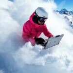 Un video estilo UGC de aventura extrema de 12 segundos, mostrando a una mujer snowboarder concentrada y enérgica bajando a toda velocidad una ladera de montaña cubierta de nieve polvo virgen. Ella lleva un casco vibrante, gafas de alta tecnología y una chaqueta técnica llamativa, mientras usa una laptop robusta en sus manos. La cámara frontal, ligeramente baja, captura la nieve que salpica hacia ella y su postura dinámica mientras ajusta el equilibrio en los desniveles y sortea obstáculos. La iluminación es de sol brillante de media mañana, con una paleta de azules fríos, blancos intensos y los colores saturados de su equipo. El sonido principal es el silbido del viento y el rugido potente de la nieve desplazada, complementado por el tecleo rápido y el crujido de la tabla. El acabado incluye grano de película sutil y una LUT de aventura cinematográfica, con un póster frame de ella en pleno salto, rodeada de nieve y con la laptop visible. –ar 9:16