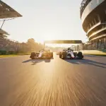 A hyperdetailed, immersive cinematic sequence capturing the visceral intensity of the Formula One Grand Prix in Mexico City during the critical final laps of the race. The setting is dominated by the Autódromo Hermanos Rodríguez, specifically focusing on the transition between the high-speed main straight and the gladiatorial atmosphere of the Foro Sol stadium section. The lighting is crucial: a late afternoon golden hour transition, where the sun sits low and sharp, creating dramatic chiaroscuro effects.