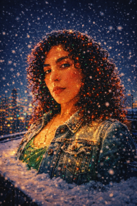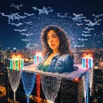 A hyper-realistic aerial night photography shot of a massive, colossal drone light show formation floating above a city skyscraper. The drones form a precise, glowing portrait of this exact mascot from the uploaded image, composed of thousands of individual, distinct colored LED points in a pointillist style. The face is illuminated against the dark sky. The rooftop directly below features large neon Christmas gift box light structures and hanging curtain lights. In the background is a sprawling metropolis skyline with distant fireworks. Cinematic lighting, 8k resolution, highly detailed texture of the individual lights, wide angle.