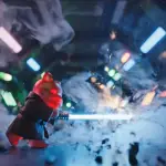 A low-angle, cinematic tracking shot follows a translucent, cherry-red gummy bear Jedi, diminutive yet commanding in miniature brown robes, navigating a smoke-choked, neon-lit Star Wars corridor. The camera employs shallow depth of field, keeping the tiny protagonist sharp against swirling debris and distant blaster fire. Action accelerates to a flurry of movement as the Gummy Jedi ignites a miniature, intensely glowing blue lightsaber, the energy hum palpable. Quick, dramatic whip-ans and fast push-ins capture the intense lightsaber duel against an unseen Sith opponent, emphasizing the immense scale difference. The camera circles rapidly during parries, moving from a close-up on the bear’s resolute, slightly squishy face, to sweeping wide shots that emphasize the speed of the tiny combatant’s spins and aerial flips. The final motion is a powerful upward slash, captured with a dramatic slow-motion dolly zoom that pulls focus from the impact to the determined shimmer of the victorious Gummy Jedi.