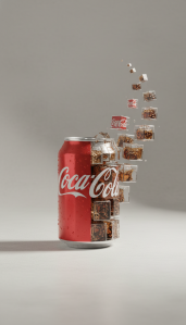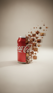 A high-resolution, photorealistic cinematic animation showcasing the decomposition and re-composition of a standard aluminum Coca-Cola can in a controlled studio environment. The entire sequence utilizes sophisticated fluid dynamics simulation and highly detailed texture mapping. SCENERY: The object rests centered on a seamless infinity cyclorama backdrop, rendered in a pale, warm taupe matte texture, establishing a sterile, high-end product presentation atmosphere. LIGHTING: Controlled, high-key lighting setup using a large cinematic softbox as the key light, positioned slightly above and to the left, creating a subtle, elongated shadow grounding the can. Strong, localized rim lighting emphasizes the curved edges and the hyper-realistic surface condensation, highlighting the microscopic water droplets glistening on the vibrant red polished aluminum. The atmosphere is crisp, cool, and hyper-detailed, maximizing specularity and subsurface scattering effects on the granular elements. TEXTURE: The left half of the can remains perfectly intact, covered in bead-like condensation, reflecting the soft studio light. The right half undergoes a complex disintegration process. PHASE ONE: INITIATION AND SUGAR FRAGMENTATION. The animation begins with a tight Medium Close-Up (MCU) of the intact, sweating can. A subtle, slow dolly zoom begins as a perfectly vertical fracture line appears. The right half instantly decomposes into thousands of precise, identical cubic fragments (approximately 1cm x 1cm x 1cm). These fragments are texturally varied: brilliant white granulated sugar cubes, dark crystalline brown sugar cubes, and cubes stained deep crimson, representing flavor concentrate. These sugar cubes immediately begin accelerating outwards in a controlled, non-chaotic vector flow, rising vertically and diverging laterally from the can’s axis in a highly stylized laminar flow pattern. PHASE TWO: LIQUID CUBE DISPERSAL. The motion transitions into the second form of fragmentation. The right half reconstitutes itself briefly, only to shatter again, this time yielding clear, square acrylic or glass containment boxes. Inside each cube is a perfectly contained volume of highly saturated, dark amber cola liquid. The internal fluid dynamics show subtle, realistic sloshing and movement within the transparent boxes as they ascend. A dynamic orbital tracking shot encircles the object at eye level, focusing sharply on the reflectivity of the glass cubes, catching the reflection of the surrounding studio environment. Look for internal details, such as microscopic bubbles within the simulated cola liquid and the slight prismatic distortion caused by the cubed geometry. PHASE THREE: RECONVERGENCE. The dispersed particles (sugar, liquid cubes, and a third wave of small, shattered crystalline powder fragments) reach their maximum point of dispersion, filling the frame in an aesthetically balanced composition adhering to the rule of thirds. Following a brief 500-millisecond pause at peak dispersion, the motion executes a dramatic, high-speed reverse simulation. All fragments rapidly accelerate inwards, converging with extreme precision back into the vertical seam. The motion blur should be intensely stylized during this convergence phase. FINAL SHOT: The two halves of the can perfectly weld back together, resulting in a single, unified, icy-cold, perfectly polished product beauty shot. The camera executes a slow, deliberate push-in (dolly move) toward the perfectly centered, static can, ending the sequence on a sharp focus of the iconic white logotype and the hyper-detailed condensation. Film grain subtle, aspect ratio cinematic, color grading high contrast, saturated reds. End frame frozen on the perfect can.