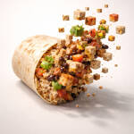 Minimalist food photograph – a single “burrito” rests on a light, matte surface and is captured mid-transformation into a 3D pixelized form: one half remains intact while the other organically fragments into large, floating cubes that drift outward, each cube revealing the object’s texture, ingredients, and colors. Studio lighting with soft, realistic shadows, shallow depth of field, tasteful perspective and composition, hyperrealistic detail, stylish geometric abstraction, subtle motion blur on the cubes, high resolution, cinematic close-up. –ar 16:9