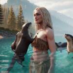 Incredibly beautiful Norwegian with blue eyes, long eyelashes, black eyeliner, freckles. Dressed in a prehistoric skirt, extremely strong body, she swims with otters, one of them kisses her on the face, incredible atmosphere and tranquility, clear details, perfect image, Full body, full realism, clear details, perfect image.