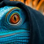 A hyper-stylized, high-resolution cinematic portrait sequence focusing on an exceptionally detailed turquoise-blue iguana or large lizard wearing a deep obsidian black, matte cotton hoodie. The subject occupies the majority of the frame, set against an absolute zero-lux black void, emphasizing dramatic negative space and meticulous textural contrast. The atmosphere is one of brooding intensity and neo-noir mystery. The lighting design is a complex three-point setup: the Key Light is a cool, hard-edged cyan source positioned high and slightly to the left, catching the angular facets of the cranial scales. A powerful orange-amber rim light provides dramatic separation from the black background, intensely highlighting the subject’s silhouette, especially the spiky, segmented crest of glowing orange dorsal fins protruding from the back of the cinched hood. An initial Extreme Close Up (ECU) focuses on one eye, rendered in vivid amber and crimson tones, detailing the vertical slit pupil which contracts slightly, demonstrating a micro-movement of observation. The iris is surrounded by concentric, highly wrinkled rings of white scale. A slow, almost imperceptible rack focus pulls back slightly, revealing the corrugated, muscular structure of the lizard’s prominent dewlap and gular folds, which pulse rhythmically, conveying slow breathing. The camera maintains a very shallow depth of field, keeping only the eyes and snout in razor-sharp focus while the edges of the heavy fabric hood fall into creamy bokeh. The texture is paramount: the reptilian skin is captured with photorealistic precision, each microscopic scale defined and tessellated like polished turquoise stone, featuring subtle subsurface scattering that gives the blue an internal, bioluminescent glow. The contrasting texture of the hoodie fabric is rough, matte, and light-absorbing, a stark textural counterpoint to the smooth, damp appearance of the scales. The shot is composed from a slightly low angle (Worm’s Eye View) to maximize the perceived size and inherent authority of the creature. Motion is slow and deliberate; the sequence features a gentle, almost imperceptible Steadicam push-in toward the face, lasting several seconds, increasing the psychological tension. Mid-sequence, a heavily textured, segmented orange claw, mirroring the color of the dorsal fins, tentatively emerges from the cuff of the black sleeve and twitches before retracting, a quick, sharp action filmed in High Frame Rate (HFR) slow-motion. The final action involves a sudden, decisive tilt of the head, breaking the intense eye contact and pivoting the focus down and away from the lens, signaling the end of the stare-down. The final frames capture the specular highlights reflecting off the wet-looking nostrils and the slight trembling of the mandibular scales. The overall aesthetic is hyper-saturated, gritty, cinematic 8K resolution captured on an anamorphic lens for a wide, compressed visual field, emphasizing the monumental scale of the small subject.