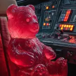 A massive, photorealistic gummy bear, rendered in translucent, hyper-detailed ruby red, slumps into the pilot seat of the iconic Millennium Falcon cockpit. Its sugary body catches the intense, chaotic neon glow of the complex dashboard controls—harsh orange indicator lights fighting deep cerulean screens. Emphasize the stark juxtaposition of the jewel-toned, sticky candy texture against the gritty, battle-scarred metal and distressed leather of the sci-fi interior. Dramatic Star Wars cinematic lighting creates brilliant highlights and deep shadows, illuminating the bear’s sugary indentations as it stares blankly through the viewport towards the distant galaxy. –ar 9:16
