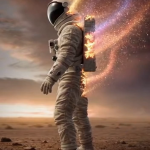 Un retrato cinematográfico surrealista, en contrapicado, de un astronauta disolviéndose en puro polvo de estrellas y energía. La figura se yergue dramáticamente sobre un campo desolado y seco en la Tierra, bajo un cielo crepuscular ominoso y melancólico, lleno de nubes oscuras y arremolinadas. El traje espacial vintage, de color blanco-beige, está intensamente detallado y arrugado, capturando una sensación de peso y desgaste. El personaje está en una pose dinámica, casi como la de un bailarín, de espaldas al espectador. Brillantes corrientes de energía dorada, luminosa y eléctrica, junto con purpurina cósmica multicolor, explotan desde la espalda y el costado del traje, rasgando la tela y fusionándose en arcos de relámpagos brillantes que enmarcan el casco. El visor oscuro refleja la atmósfera tormentosa y brillante, mientras que la tierra en primer plano se muestra con texturas secas y marrones que contrastan con la luz celestial y cegadora que emana de la desintegración cósmica. La escena se caracteriza por una iluminación volumétrica hiperdetallada, un estilo fotorrealista tipo Octane Render, y una calidad de arte conceptual en 8K.