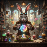 1024x1024 google_nanoMasterpiece (wide angle shot) , Easterbunny crafting an incantation, (creating a little colorful magic egg in a nest:1.6), standing on an old carved table in a colorful factory laboratory. fantastic view