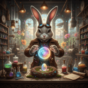 Masterpiece (wide angle shot) , Easterbunny crafting an incantation, (creating a little colorful magic egg in a nest:1.6), standing on an old carved table in a colorful factory laboratory. fantastic view