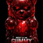 A highly detailed, vertically oriented movie poster featuring a single, menacing, translucent crimson gummy bear dominating the frame. The bear is rendered with extreme photorealism, emphasizing the wet, sticky, slightly melted texture of the candy. It is illuminated by harsh, singular overhead lighting that casts deep, unsettling chiaroscuro shadows, giving the scene an overwhelming sense of dread and tension typical of a psychological thriller. A faint, eerie red glow pulsates from within the gummy bear’s translucent core, making its small, shadowed features appear malefic and hyper-focused. The background is a stark, absolute black void, amplifying the disturbing isolation of the subject. The final image must possess the high-contrast, cinematic quality of a polished 16k horror film advertisement.
