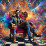 image of a man sitting on a luxurious throne, dressed in a psychedelic black suit with bright colors and wearing yellow sunglasses, The background should be surreal with vibrant and psychedelic patterns and colors, illuminated with bright lights, artistic style and slightly exaggerated like a fairy tale
