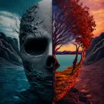Surreal Nature vs Human nature poster lided by the middle , Fantastic look