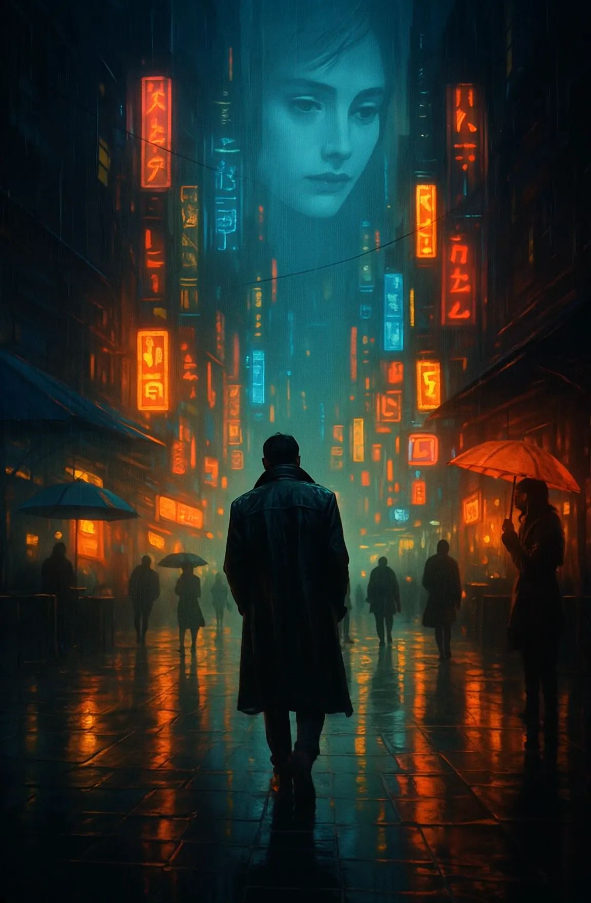 The camera follows the man in the trench coat from behind as he walks slowly forward through the rain-soaked, neon-lit street. Umbrellas sway, pedestrians move naturally in various directions, and rain continuously falls, creating ripples and reflections on the wet pavement. Neon signs flicker and cast colorful glows on surrounding surfaces. The giant holographic face above subtly shifts expression, eyes blinking slowly. The scene is filled with lifelike motion—clothing rustles in the wind, steam rises from grates, and soft ambient lighting pulses through the environment.