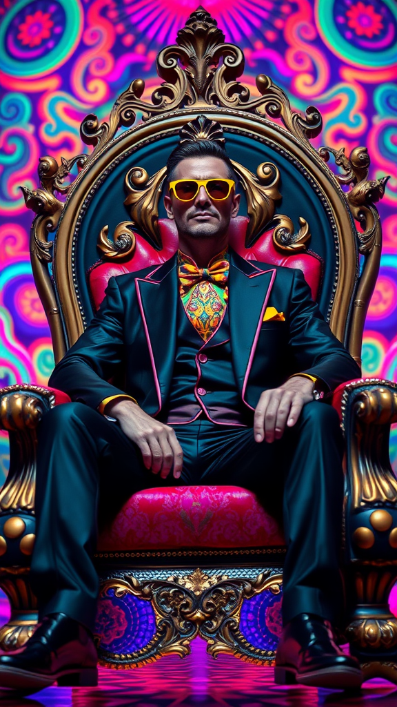 image of a man sitting on a luxurious throne, dressed in a psychedelic black suit with bright colors and wearing yellow sunglasses, The background should be surreal with vibrant and psychedelic patterns and colors, illuminated with bright lights, artistic style and slightly exaggerated like a fairy tale