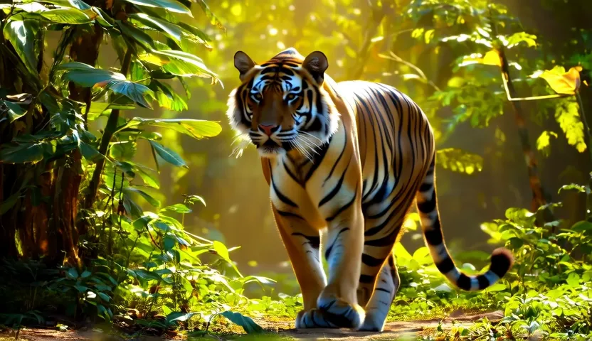 A majestic Bengal tiger, fur richly colored, strides through a lush, sun-dappled rainforest. Vibrant green foliage surrounds it, sunlight filtering through the canopy. The tiger’s muscles ripple beneath its sleek coat as it moves with grace and power. High-resolution, cinematic lighting, 8k.