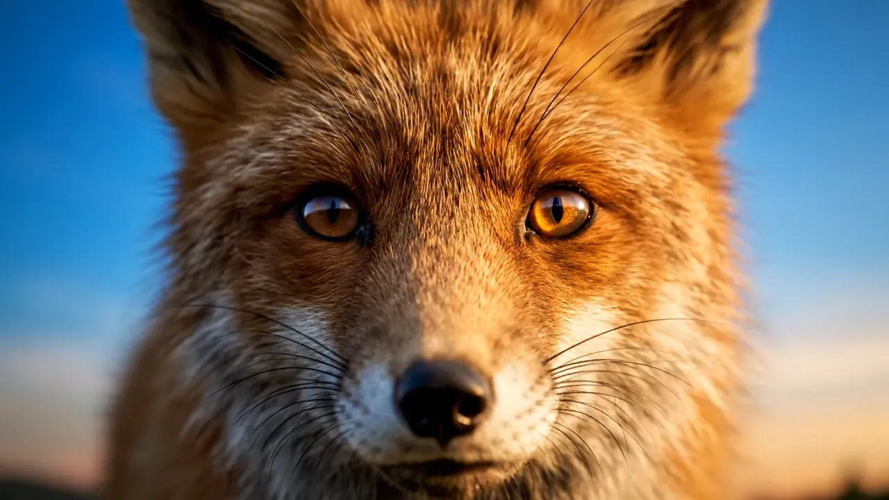 A hyperrealistic portrait of a fox with a clear, vibrant sky. Focus on intricate fur detail and a sense of wild, untamed beauty. 8k resolution, cinematic lighting.