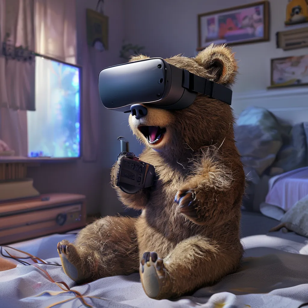 A little bear is wearing an HMD and having fun playing a VR game in his room