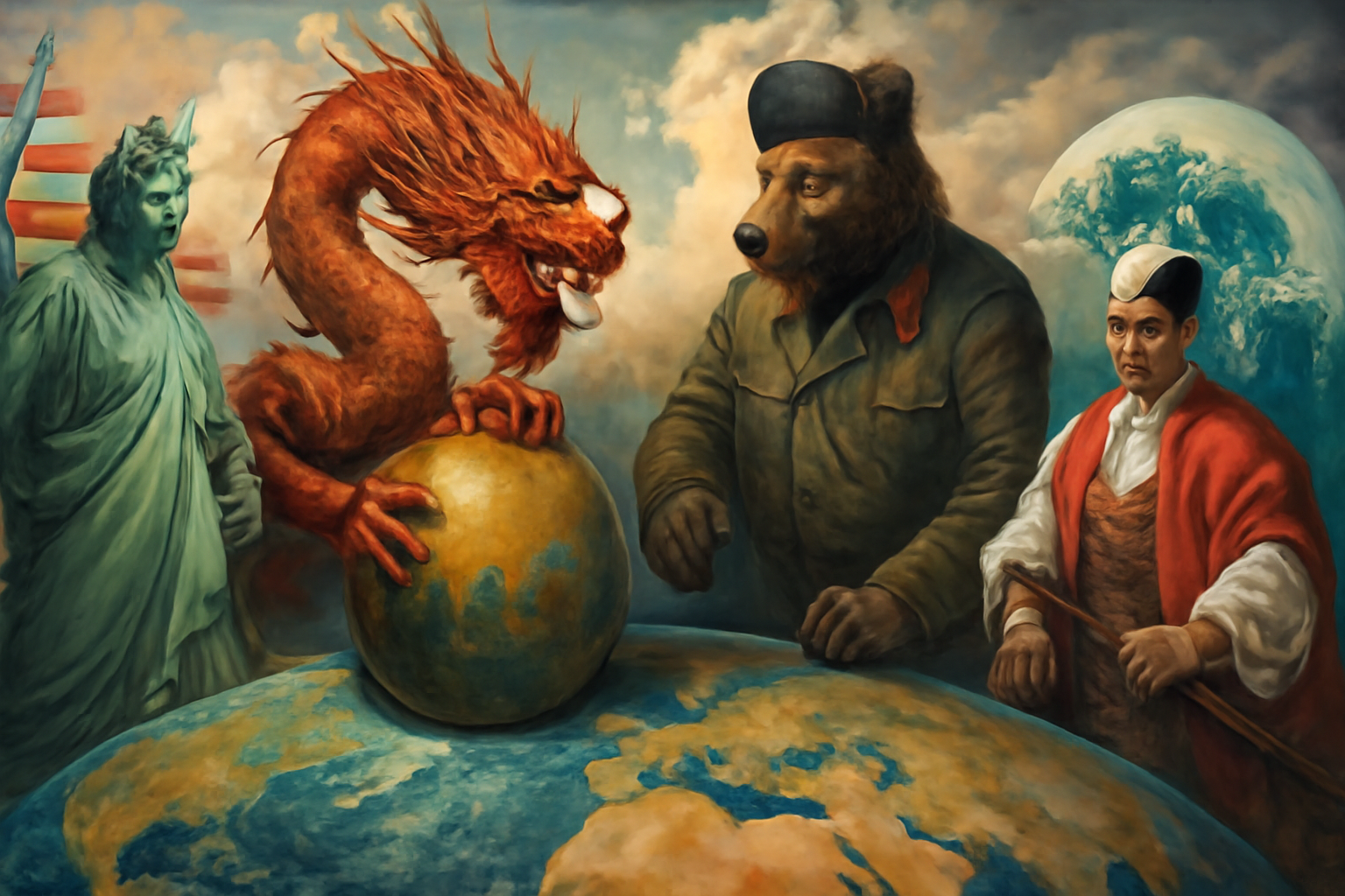 A stylized depiction of a multipolar world: several powerful nations represented by distinct, symbolic figures, each with their own sphere of influence, interacting in a complex, dynamic, and sometimes tense, global landscape. Use vibrant colors and intricate details.