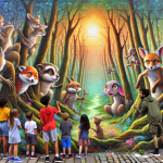 A whimsical street artist paints a giant mural of a magical forest on an urban wall, surrounded by curious children and playful animals. The scene bursts with vivid colors, showcasing fantastical creatures peeking from the trees, while the sun sets in a golden sky, casting long shadows.. Photorealistic style, vibrant colors.
